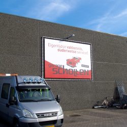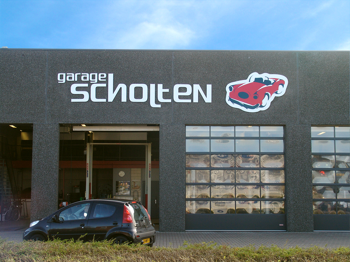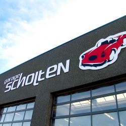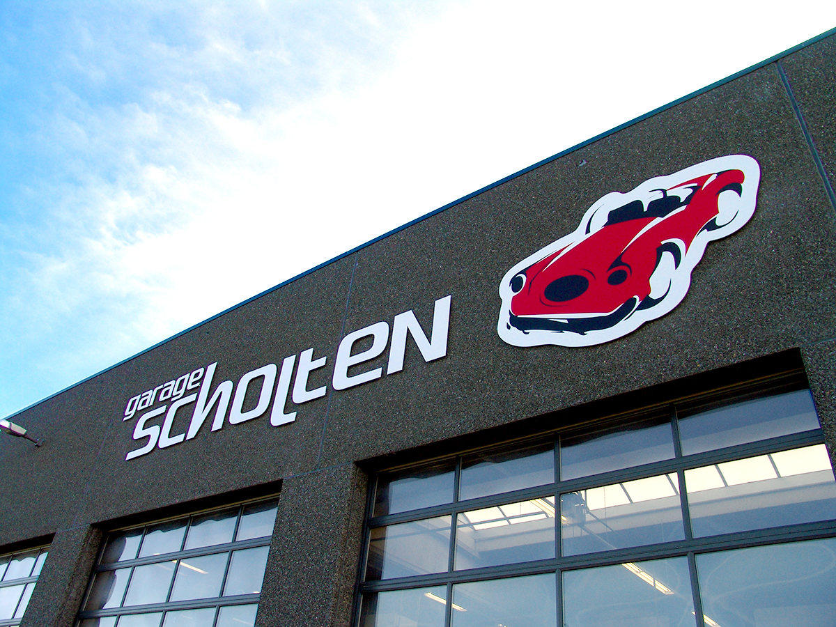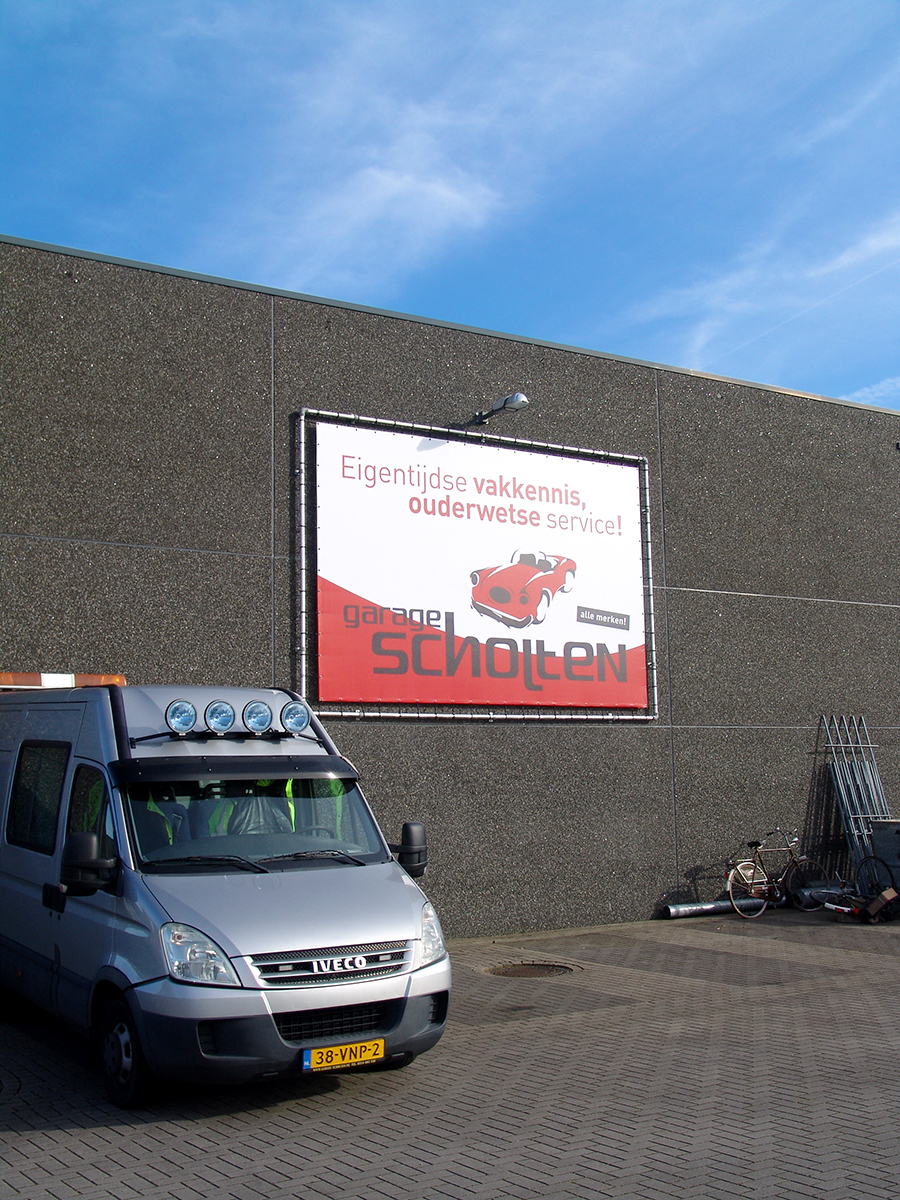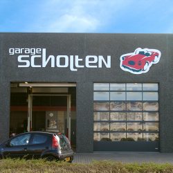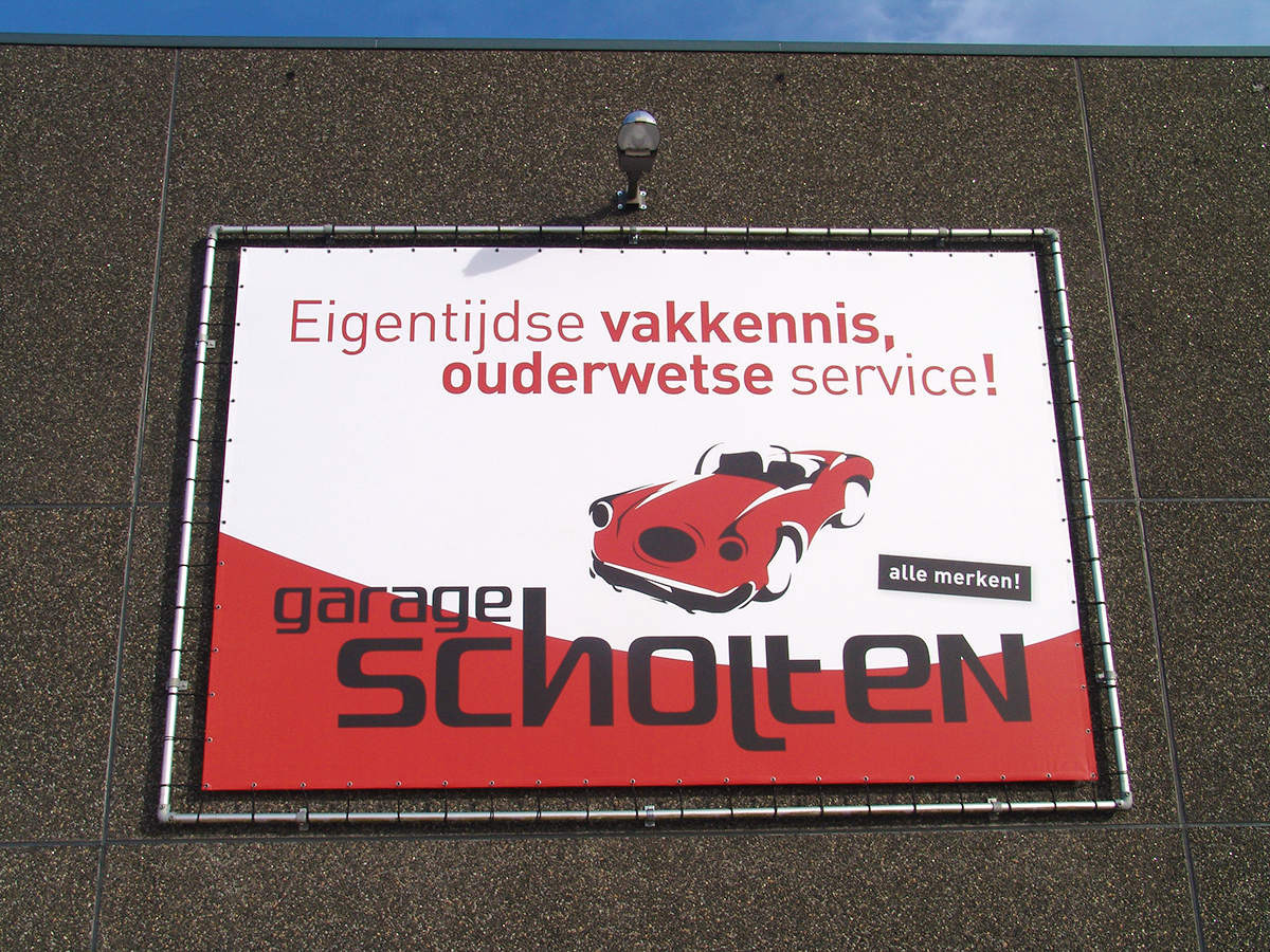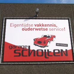 portfolio pandbelettering Garage Scholten is voortaan niet meer te missen voor voorbijrijders, dankzij deze flinke gevelbelettering uit Acrylox en een bijpassend spandoek. Bij lekker in vorm mochten we zowel ontwerp als realisatie ervan regelen. acrylox pandbelettering vooraanzicht pandbelettering spandoek spandoek
