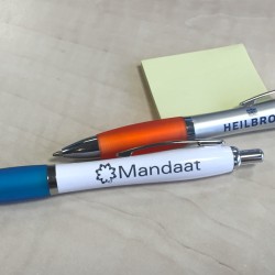 Kunnen jullie ook pennen beletteren? Dat was de vraag van Heilbron en Mandaat. Jazeker! lekker in vorm ging eerst op zoek naar prettig schrijvende bedrijfspennen met huisstijlkleur en voorzag deze vervolgens van belettering in de vorm van logo’s.