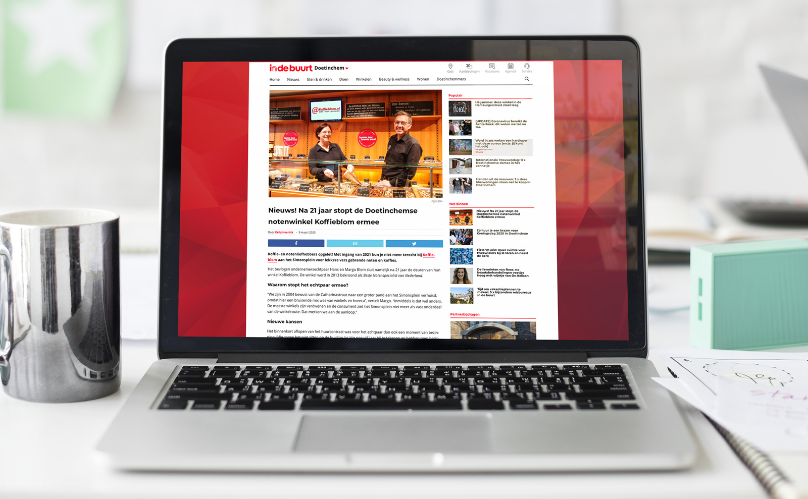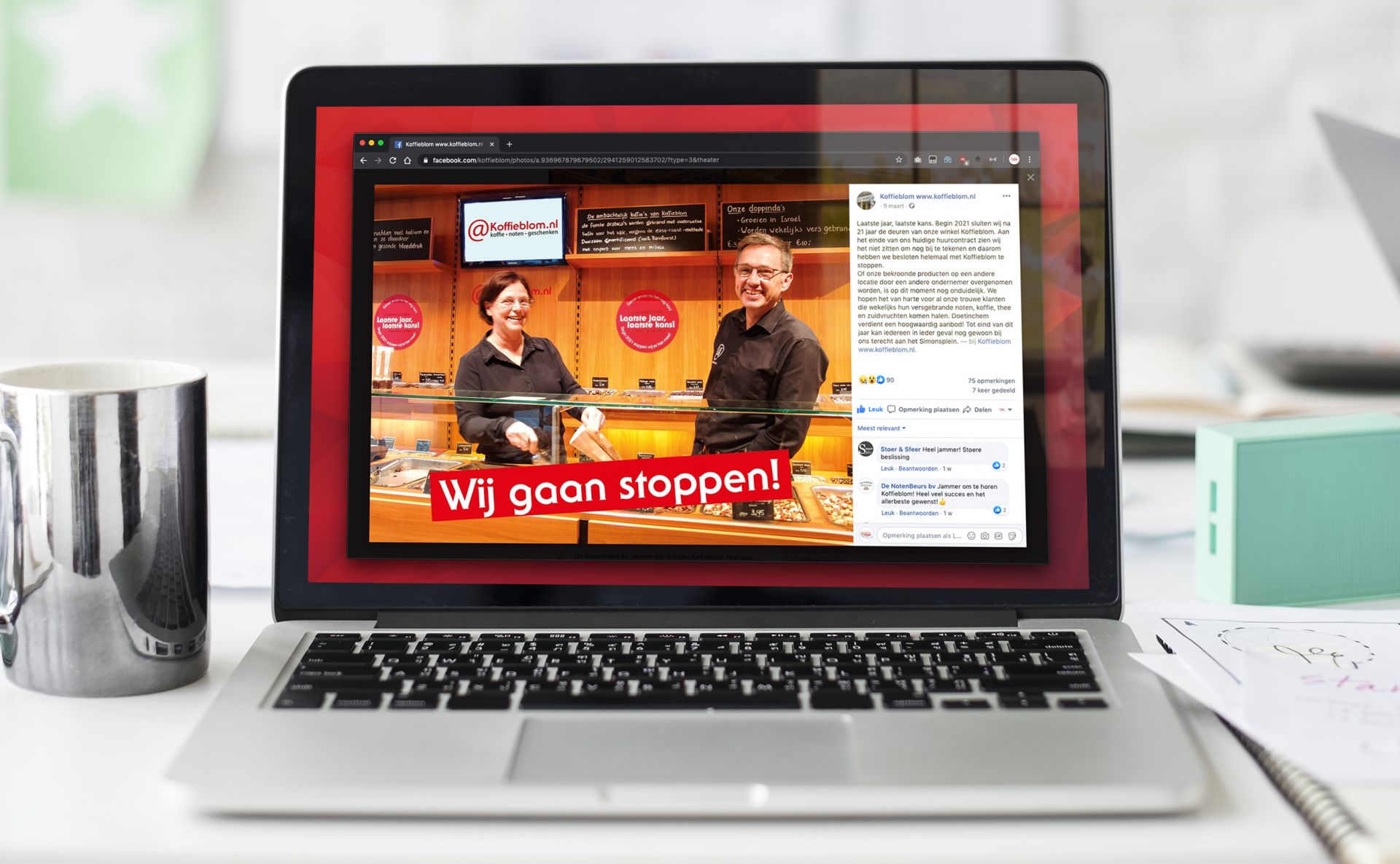 Koffie- en notenspeciaalzaak Koffieblom benaderde ons bij lekker in vorm voor hulp bij het wereldkundig maken van hun sluiting begin volgend jaar. We regelden daarvoor aankondigingsstickers, zetten het ondernemersechtpaar Margo & Hans op de foto en schreven een pakkend, positief ingestoken persbericht. Ook berichtgeving op social media mocht natuurlijk niet ontbreken. Het persbericht werd onder andere opgepakt door lokale media als De Gelderlander en Indebuurt.nl.