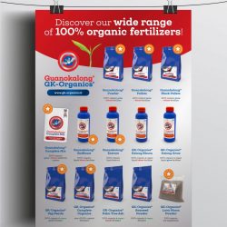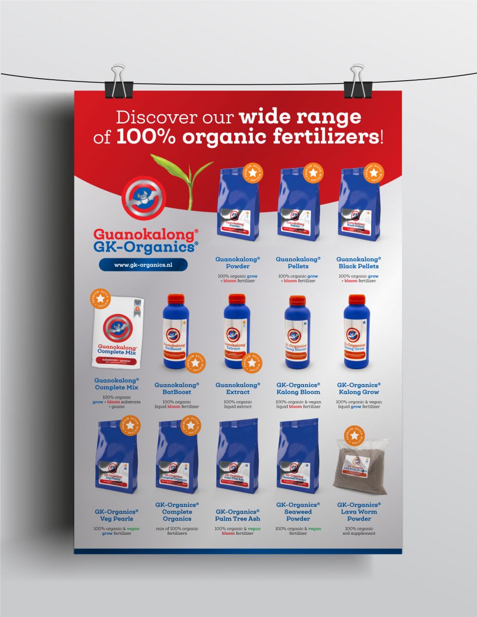 portfolio poster productrange Benieuwd naar de complete productrange van Guanokalong / GK-Organics? Speciaal voor wederverkopers mochten we er bij lekker in vorm een handige overzichtsposter van ontwerpen. poster productrange