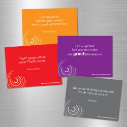 Via inspirerende quotes moedigt Gastvrijheid in Bedrijf iedereen aan om complimenteuzer en gastvrijer te zijn. De quotes verschijnen op social media en zijn als sets te bestellen in gedrukte vorm. Er verschijnen regelmatig nieuwe varianten. lekker in vorm maakt deze quotes op binnen de huisstijl en voorziet ze geregeld van simpele maar doeltreffende speelsheden.