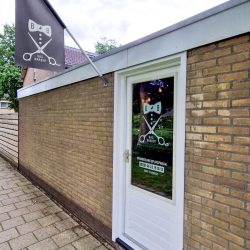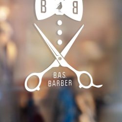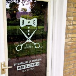 Naast een kioskvlag mochten we voor de zichtbaarheid van Bas Barber raambelettering ontwerpen en verzorgen, uitgesneden uit wit Oracal folie. Zo is voor bezoekers en toevallige passanten niet te missen dat er zich achter de deur een heuse barbershop bevindt. En voor het eenvoudig maken van een afspraak buiten kniptijden staat Bas telefoon-/whatsappnummer er ook bij vermeld.
