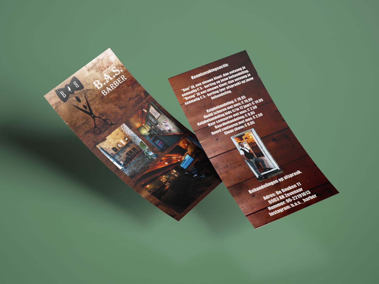 Na restyling van zijn logo mochten we ook de flyer / prijslijst van Bas Barber onder handen nemen. Zijn gezicht en salon kregen hierop een meer prominente plek, voor herkenbaarheid en laagdrempeligheid. Daarnaast dachten we kritisch met Bas mee over een duidelijke indeling van zijn prijzen en een opvallende plek voor zijn kennismakingsactie. Uiteindelijk hebben we de flyer op lekker stevig papier laten drukken, zodat deze qua uitstraling past bij de kwaliteit van de salon.