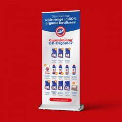 Een roll-up banner mag niet ontbreken in een standaard beurs-kit. Daarom ontwierpen we er bij we bij lekker in vorm eentje met een handig totaaloverzicht van alle Guanokalong en GK-Organics producten. Goed te gebruiken in combinatie met een bijpassend spandoek.