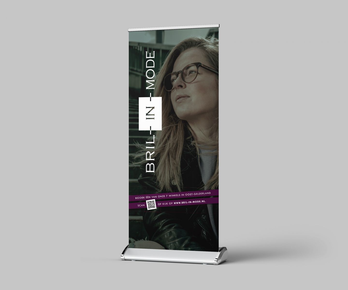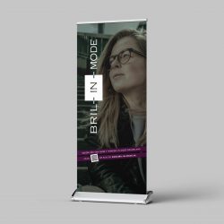portfolio set roll-up-banners Als onderneming altijd handig om over te beschikken: twee fraaie roll-up-banners die Bril-in-Mode als sfeervolle aankleding kan inzetten tijdens beurzen en presentaties. roll-up-banner man roll-up-banner vrouw