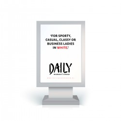 portfolio stoepbord Om het winkelend publiek in de Boliestraat óók tussen de campagnes door te attenderen op het moois van Daily women’s wear, ontwikkelde lekker in vorm twee contrasterende stoepbordposters met hoge algemene attentiewaarde. stoepbord witte zijde stoepbord zwarte zijde stoepbord geplaatst