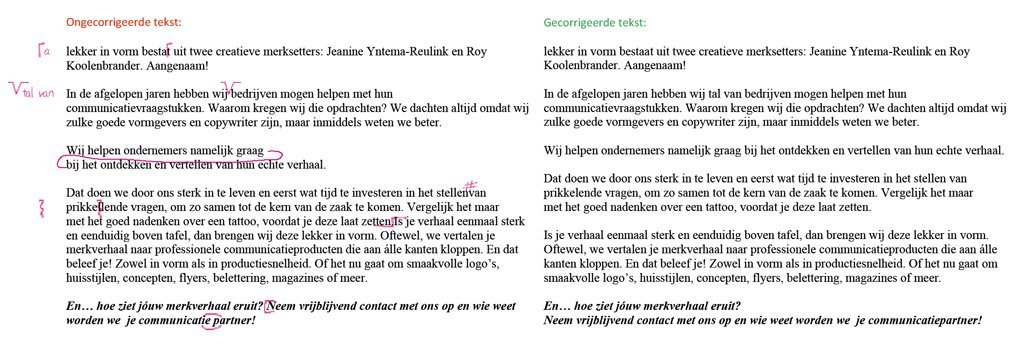 Zelfs de beste copywriter of tekstzetter maakt wel eens een foutje. Na een keer goed samen nakijken en de teksten corrigeren zie je daar als het goed is echter niets meer van terug in het eindresultaat.