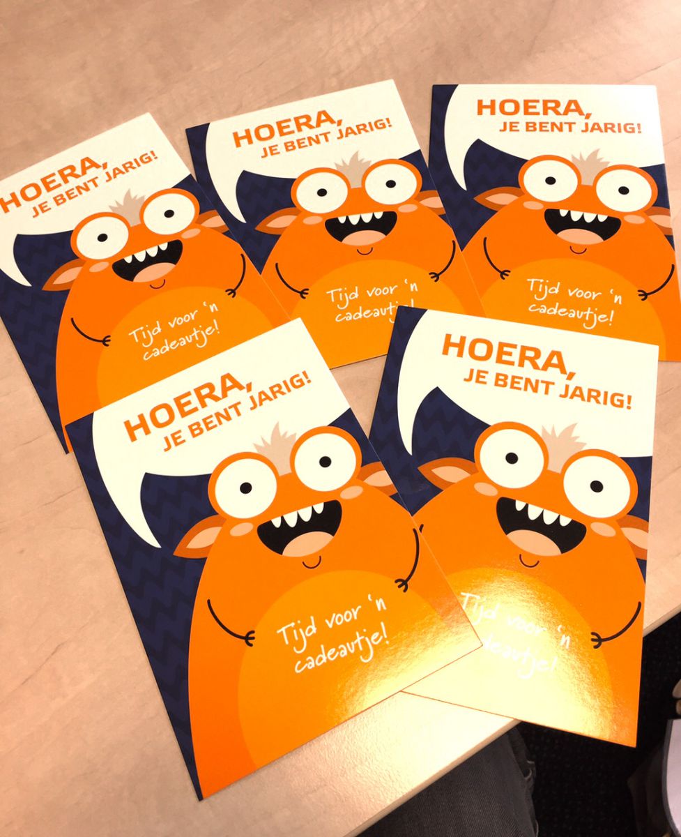 In samenwerking met haar partner RegioBank heeft Heilbron een leuke attentie voor jarige klanten tot 8 jaar: gratis een cadeautje komen uitzoeken! lekker in vorm ontwierp een monsterlijk leuke ansicht