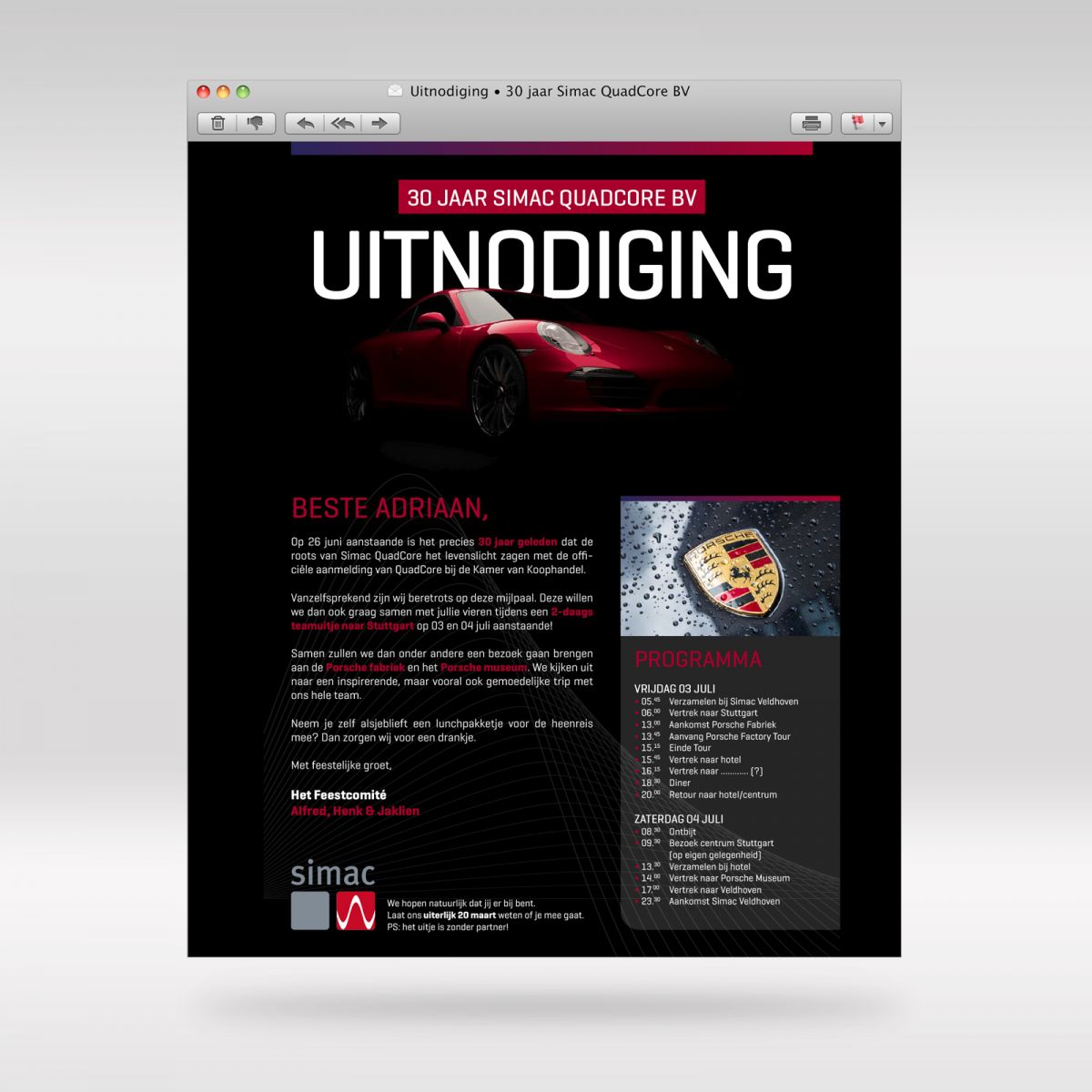 Simac Quadcore bestaat 30 jaar en trakteert haar medewerkers op een teamuitje naar Frankfurt, met onder andere een bezoekje aan de Porschefabriek daar. Bij lekker in vorm mochten we er deze gepersonaliseerde digitale uitnodiging voor schrijven en ontwerpen.