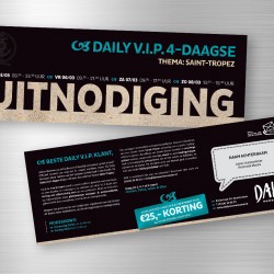 De Daily V.I.P. dagen waren weer een doorslaand succes, met een hapje en een drankje en diverse modeshows. lekker in vorm ontwierp een sprankelende uitnodiging c.q. kortingskaart en een stoepbordposter, passend binnen het thema ‘saint-tropez’.