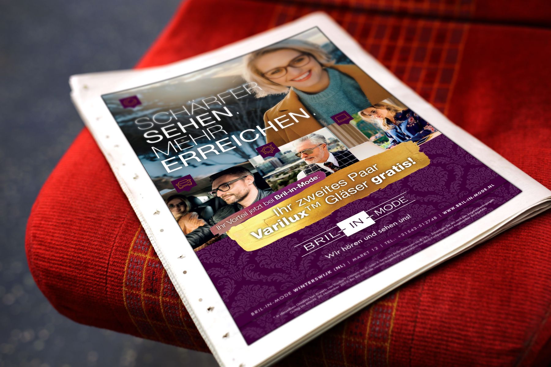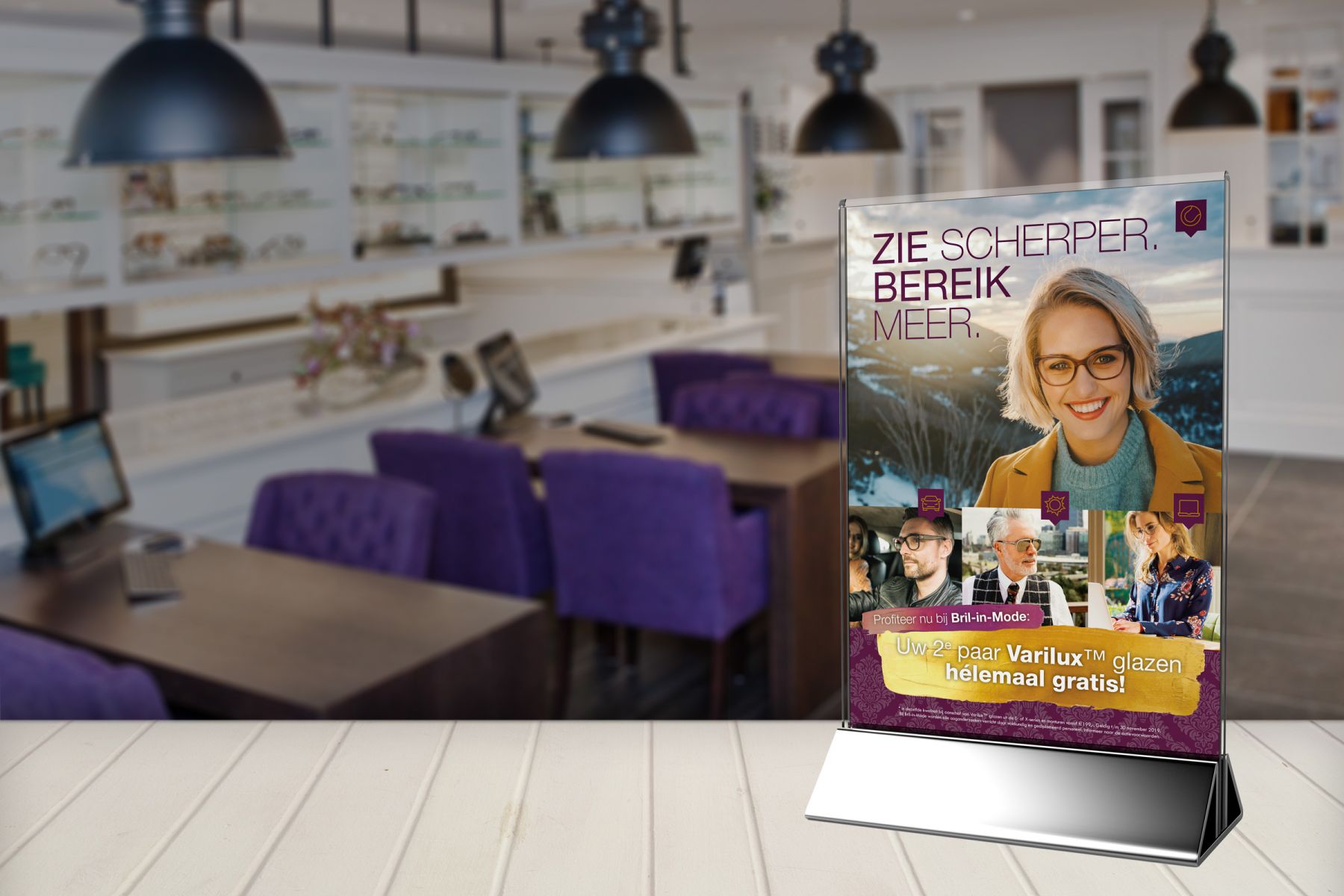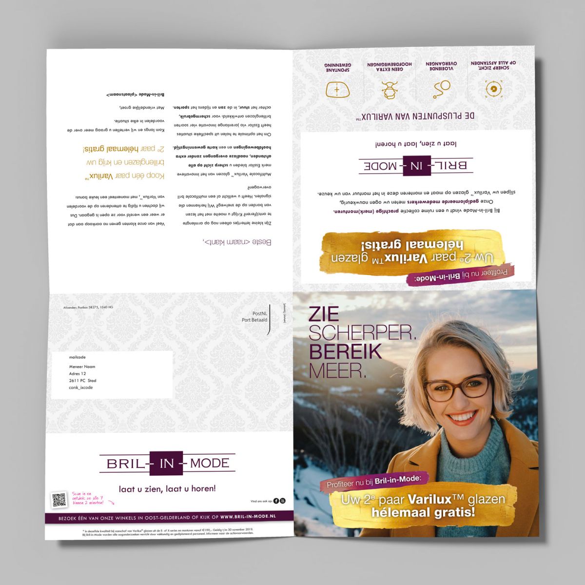 De reclamecampagne met de titel “Zie Scherper, Bereik Meer” loopt in lijn met de landelijke Essilor campagne en wordt onder de aandacht gebracht via onder andere een direct mailing naar vaste klanten en huis-aan-huis flyers met een opvallende kruisslag vouw. Deze mailingen worden ondersteund door diverse point-of-sale items in de winkel en op het web. Hierboven valt ook de bijbehorende reclamespot voor de regionale radio te beluisteren.