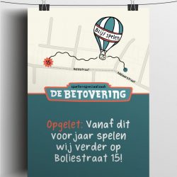 Spellenspeciaalzaak de Betovering in Doetinchem gaat komend voorjaar verhuizen naar een lekker ruim pand aan de Boliestraat! We mochten er bij lekker in vorm alvast wat mooie posters ter aankondiging voor ontwerpen. Eén variant voor in de huidige winkel in de Adelaarstraat en één op de ruiten van het nieuwe pand in de Boliestraat.