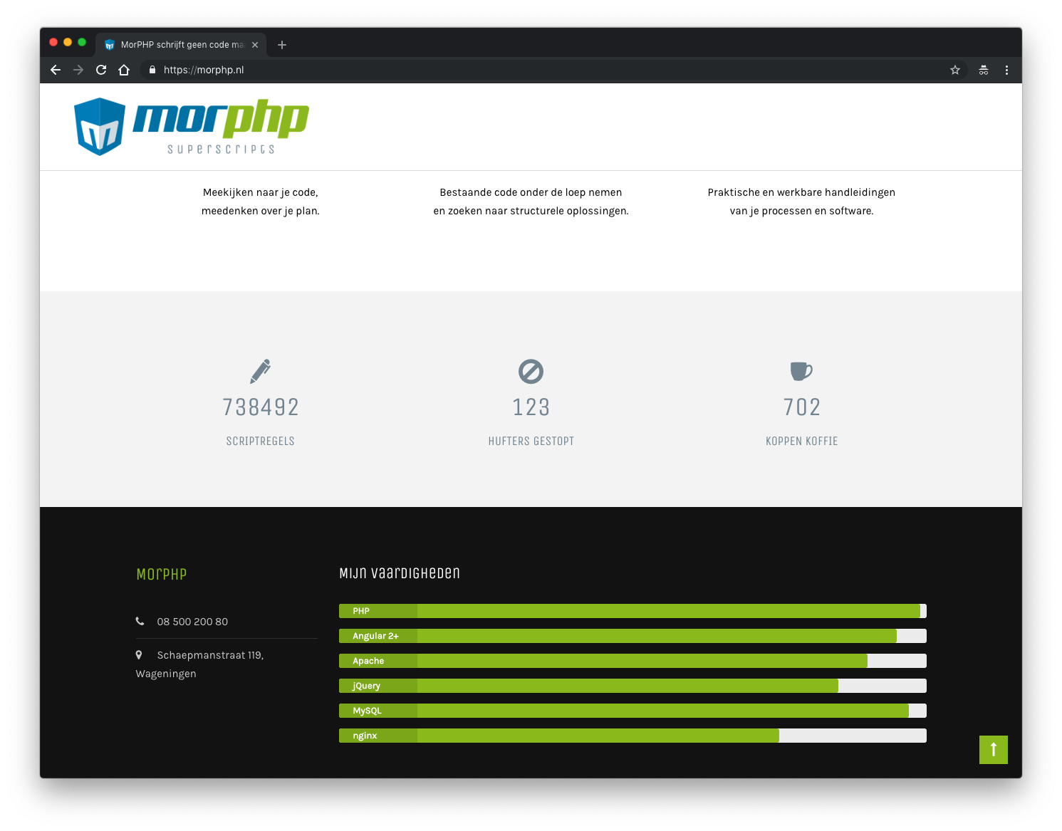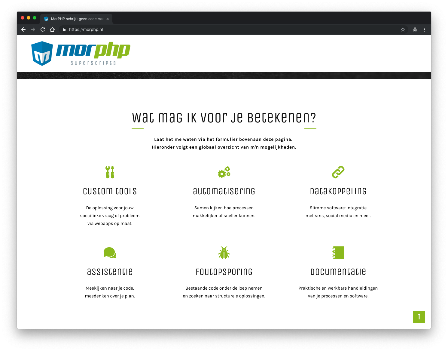 Websites coderen kan Patrick Morpey van MorPHP als geen ander, maar over de vormgeving en branding van zijn website mochten we bij lekker in vorm creatief meedenken. Samen hebben we een aangekocht 1-page template qua functionaliteit en uitstraling omgetoverd tot een sterk online merkverhaal. Met een custom made contactmodule, bondige teksten, passende fotografie en kloppende huisstijlkleuren.