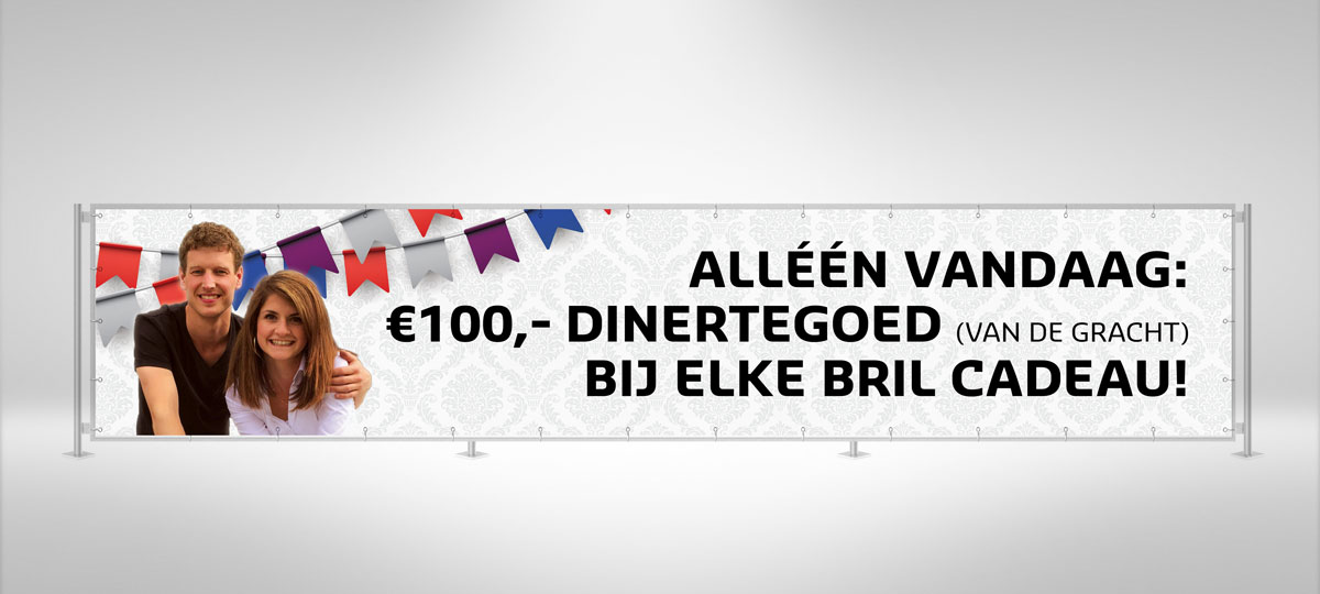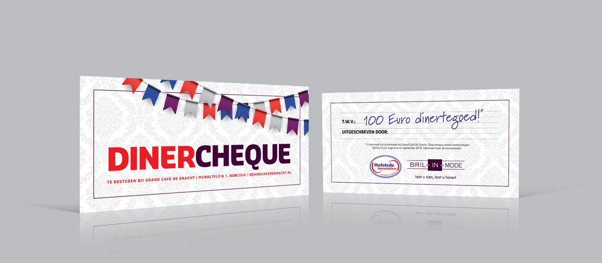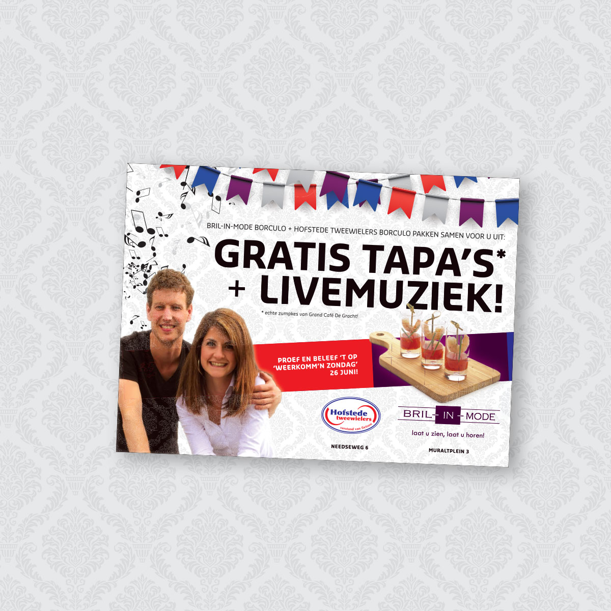 Tijdens de Weerkommn Dagen pakt het in Borculo graag geziene ondernemersduo Iffet (Bril-in-Mode) en Mark (Hofstede Tweewielers) feestelijk uit: Iedere kopende klant ontvangt een dinertegoed t.w.v. €100,-, te besteden bij lokaal grand café De Gracht. Daarnaast biedt het duo voor alle bezoekers tapa’s onder begeleiding van live-muziek. lekker in vorm zorgde voor alle campagne-items, waarin de huisstijlkleuren van beide bedrijven samen komen. De campagne omvat o.a. een flyer, gevelbanners, advertentie en dinercheque.