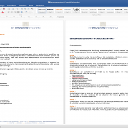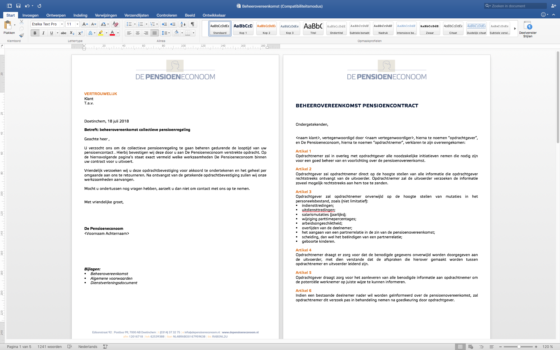 Om de beheerovereenkomsten en de dienstenoverzichten die medewerkers van De Pensioenecnoom in Word maken ook van de juiste huisstijl te kunnen voorzien, ontwierpen we bij lekker in vorm een vooringevuld Word-sjabloon met makkelijk toepasbare alineastijlen op maat.